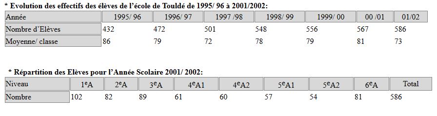 Vieille de 40 ans (1961/ 2001), l’école de Touldé n’a pas beaucoup évolué. Elle est passée d’un hangar à des salles en terre et bois et tôles de zinc dans les années 1970 et 80 et à un établissement construit en dur en 1981, mais très peu équipé: